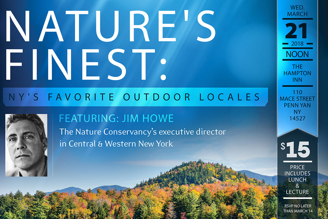 Jim Howe, executive director of the Central and Western New York Nature Conservancy, will discuss these destinations at a noon luncheon held at the Hampton Inn, 110 Mace St., Penn Yan. Mr. Howe’s virtual tour will feature Hemlock and Canadice lakes, the Montezuma National Wildlife Refuge, Zoar Valley, the Adirondacks, and other locations near Penn Yan.