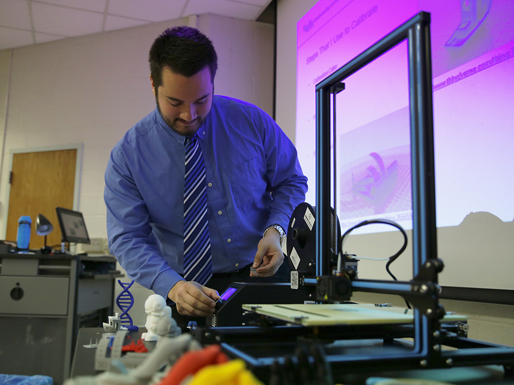 Aaron Rydzynski ’16 demonstrates the 3D technology that may one day create prosthetic limbs.