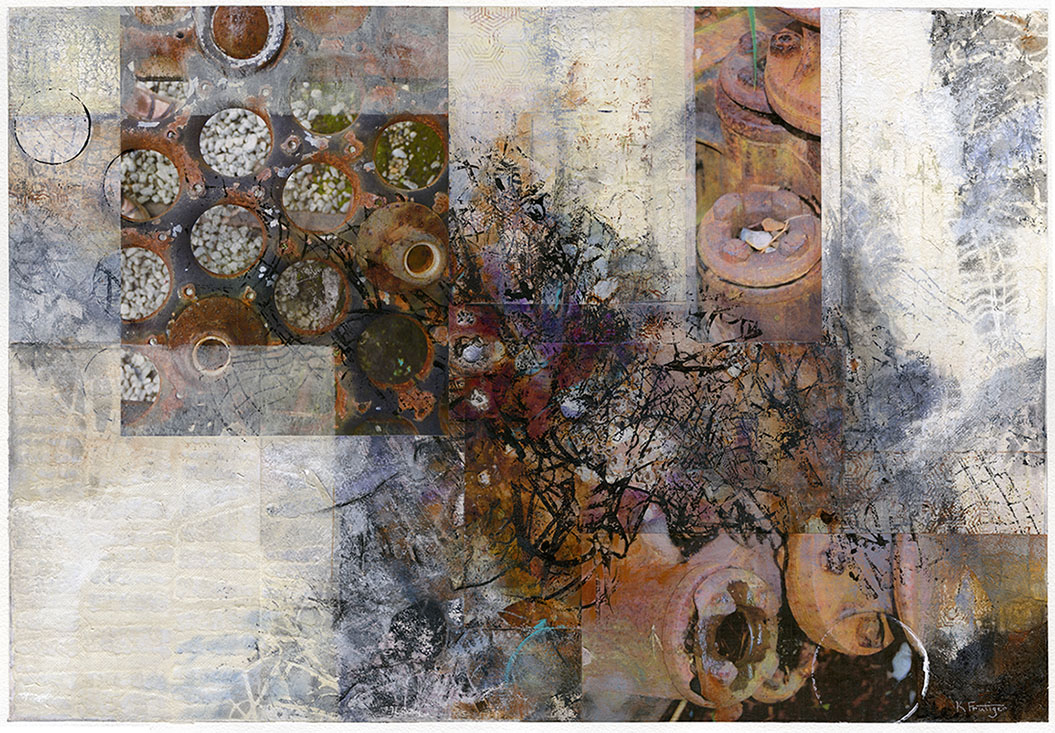Karen, a Rochester resident, says her artistic process is one of addition and subtraction, starting with random marks, drawing, collage, and paint. She then sands, lifts paint, and obscures with more collage, to create veiled layers.