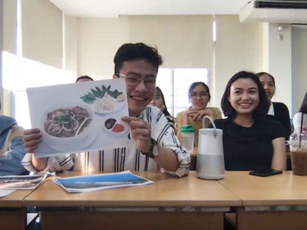 The Duy Tan students, meanwhile, displayed photos of picturesque locations near their campus, which they then described. The Keuka Park class was also treated to a view of the Duy Tan region outside the classroom windows, as Associate Professor Giss, Dean of International Programs, panned the camera.